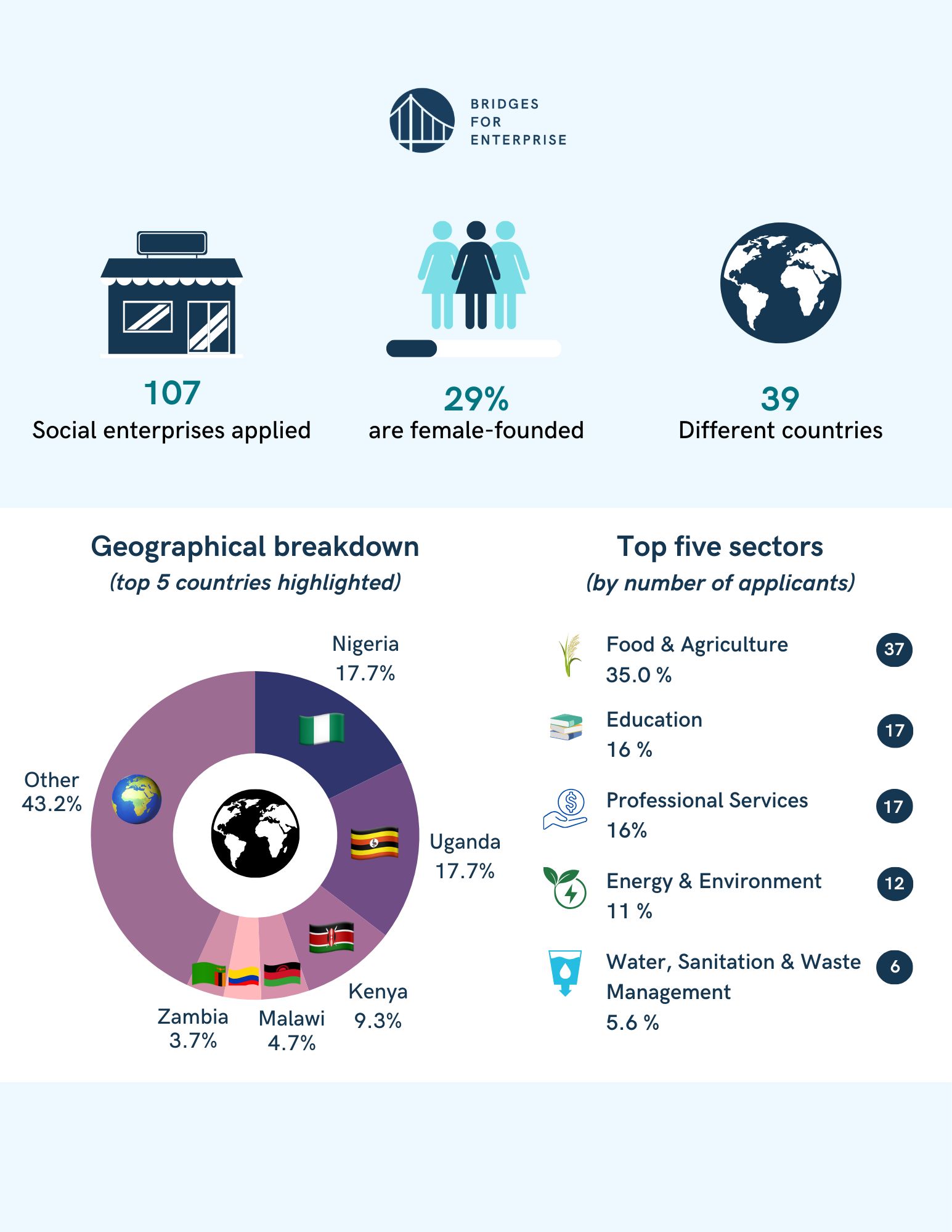 For the Spring 2026 cohort, we saw strong growth in interest, with 107 applications from 39 countries—a 75% increase in applications and 30% more countries represented compared to the previous cohort (recorded from 7th May to 31st December 2025). The diversity of applicants reflects the growing global interest in building impactful, mission-driven ventures. Here’s a snapshot of the applications we received, broken down by geography and sector.